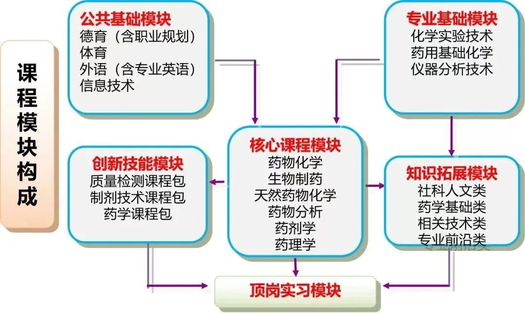 课程体系设置:药学专业以医药为基础,构建了以公共基础模块、专业基础模块、核心课程模块、创新技能模块、知识拓展模块和顶岗实习模块互为支撑的课程体系。
