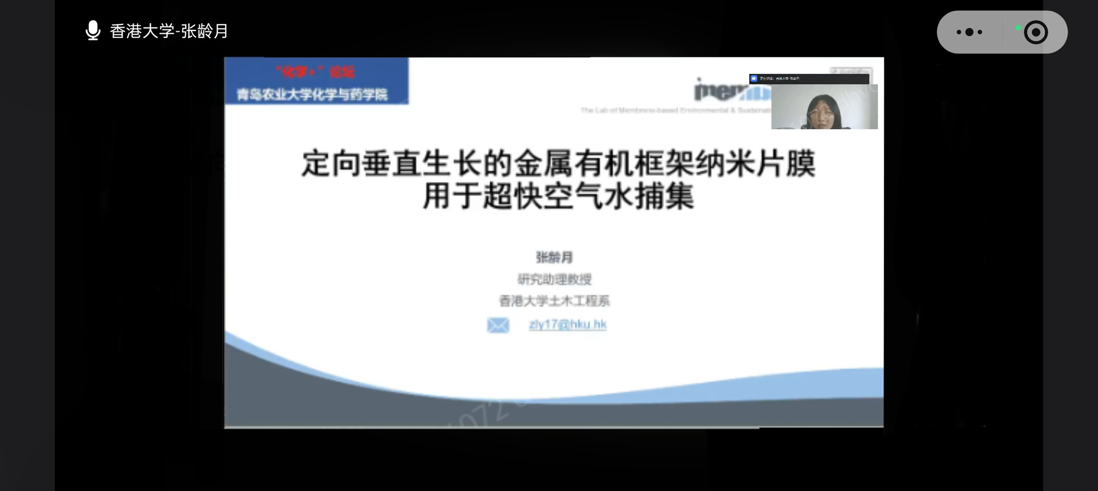 学术报告中,张龄月以“定向垂直生长的金属有机框架纳米片膜用于超快空气水捕集”为题,系统介绍了其团队在先进功能材料设计及资源可持续技术领域的最新研究进展。她重点阐释了通过精确调控金属有机框架(MOF)纳米片的定向垂直生长,构建具有新颖结构复合膜材料的创新方法。研究表明,该材料兼具高效吸附与快速传质的双重特性,为实现低能耗、高吞吐量的空气中水分捕获提供了新的材料解决方案与理论依据。张龄月进一步指出,此项技术不仅具有重要的材料科学研究价值,更为应对全球水资源挑战,尤其是缓解干旱缺水地区的饮水安全问题,提供了富有前景的技术路径。她结合具体案例,分享了在材料结构调控、性能优化及作用机理等方面的实验经验与阶段性成果,生动展示了化学、材料科学与环境工程等多学科深度交叉融合的创新潜力。