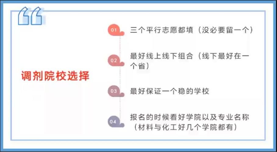 关于调剂院校的选择,学姐也给出了一系列实用建议。填报志愿时,一定要充分利用三个志愿的名额,增加调剂成功的机会。在选择院校时,建议采用线上线下相结合的方式,并且将线下复试的院校尽量选择在同一个省份,这样能有效避免因跨地区参加复试而带来的长途奔波,既节省时间和精力,又能让自己以更好的状态应对复试。同时,为了确保调剂有兜底的院校,在志愿填报中最好保证有一个相对稳的院校,毕竟每个学校的调剂缺额有限,竞争激烈。最后,报名时一定要仔细看好学院以及专业名称,确认专业代码和培养方向等关键信息,防止出现错报、误报的情况 。