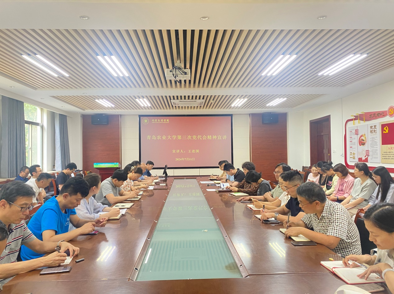 王进国结合学院实际情况,就如何深入贯彻学校第三次党代会精神,向全体教职工提出三点要求:一要切实提高政治站位,筑牢思想意识,在校党委的正确领导下,以学校第三次党代会精神为指引,抓好顶层设计,进一步优化学院相关部门协同推进的工作机制;二要凝聚育人合力,持续擦亮学生工作品牌,推动思政育人工作取得新成效;三要认真分析学院在人才培养、科学研究、社会服务等方面的发展现状和面临的挑战,学院全体教职员工要牢记使命,勇于担当,为实现学校发展目标贡献自己的力量。