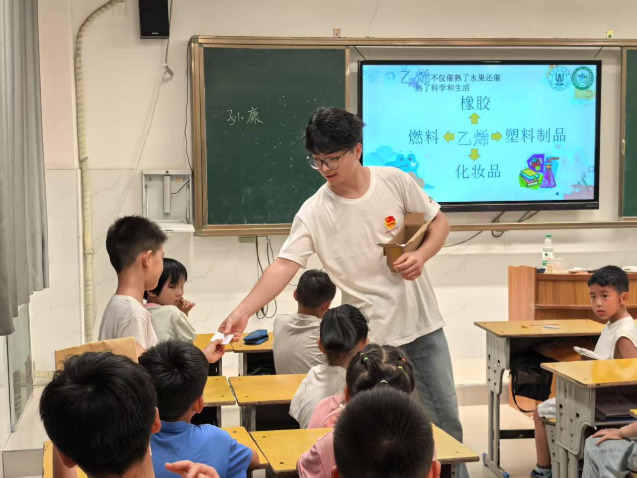 “小朋友们,你们知道苹果切开后为什么会变色吗?被蚊子叮咬后怎么才能止痒吗?”课堂伊始,实践团队队员孙康以生活中常见的现象提问,瞬间点燃了孩子们的好奇心。他结合PPT动画与实物展示,用通俗易懂的语言讲解了氧化反应、酸碱中和反应等化学原理,将抽象的知识与小朋友们的日常生活经验紧密结合。