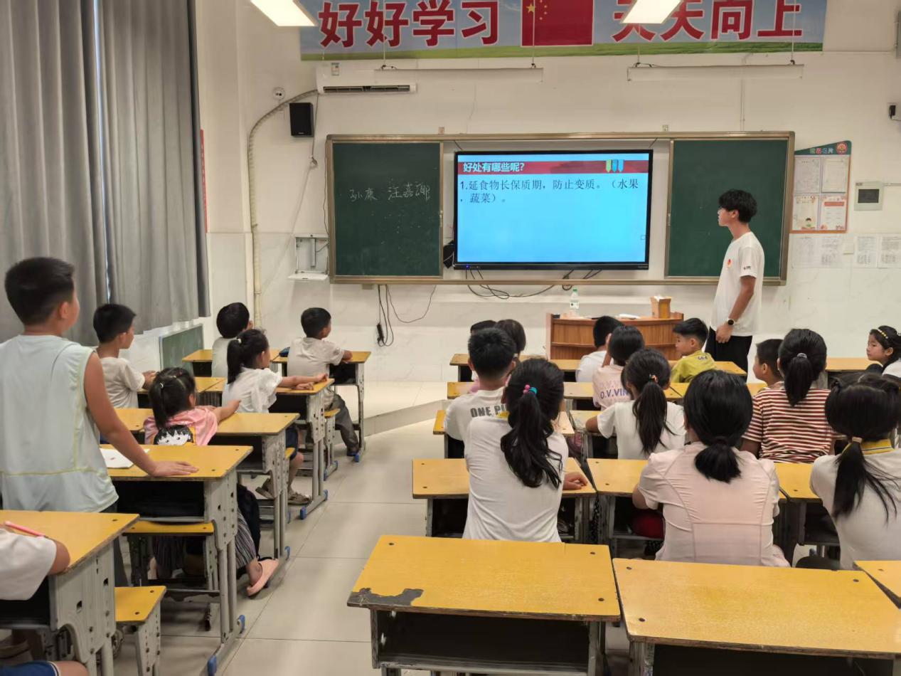 “小朋友们看这张图片,面包里的小孔是怎么来的?可乐为什么摇一摇会冒更多气泡?”课堂伊始,实践团队成员汪嘉卿用一张张色彩鲜明的食物图片搭配动画示意图,瞬间抓住了孩子们的注意力。他结合PPT中的流程图讲解:“面包发酵时,酵母菌会产生二氧化碳气体,这些气体‘撑’出了小孔,让面包变得松软;可乐里的气泡也是二氧化碳,所以打开瓶盖会滋滋冒气哦!”课堂上,实践团队成员还通过PPT展示了食品添加剂的种类、天然食材与加工食品的区别,结合“哪些零食要少吃”“如何搭配三餐更健康”等问题,与孩子们积极互动。