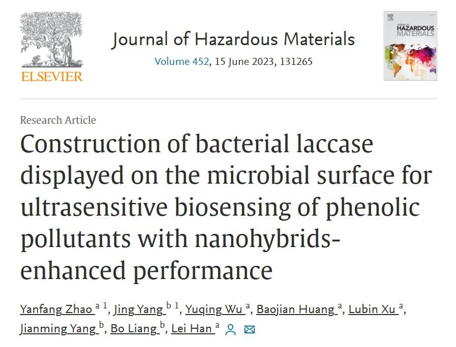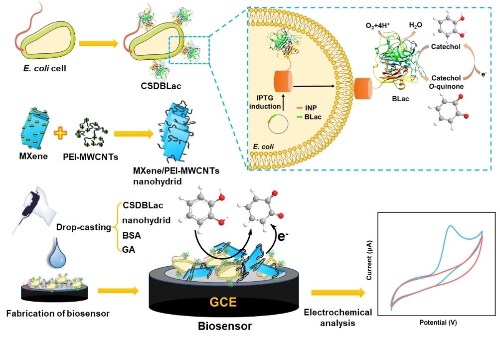 尽管细菌漆酶(BLac)具有发酵周期短、对温度和pH变化适应性强等优点,但由于BLac的细胞内分泌和电子传递效率低,将其用于制备生物传感器仍然具有一定的挑战性。我们通过微生物表面展示技术,成功构建了细胞表面展示的细菌漆酶(CSDBLac)作为全细胞生物催化剂,不仅消除了传质限制,还简化繁琐的纯化步骤。同时,设计了MXenes/PEI-MWCNTs纳米杂化物来固定CSDBLac并提高其电催化活性,成功构建了一种电化学生物传感器来检测常见的酚类污染物(图1)。本工作创新性地将BLac和纳米杂化物作为生物传感器的核心元件,不仅有效地解决了BLac在生物传感器上的应用瓶颈,而且极大地提高了全细胞生物催化剂与电极之间的电子转移效率,显著提高了酚类生物传感器的性能。该方法对于从源头上显著提高酚类及其它生物传感器性能具有重要意义。