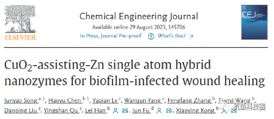 近期,williamhill体育中文孔晓颖副教授团队,韩磊教授团队、中山大学付俊教授合作在期刊《Chemical Engineering Journal》上发表了用于生物膜感染伤口愈合的 CuO2 辅助Zn单原子杂化纳米酶的文章。单原子催化剂(SAC)的特点是原子上分散着单个金属原子,由于其催化活性令人满意,因此比普通的纳米酶材料具有更优越的抗菌性能。然而,当用于治疗受生物膜感染的伤口时,由于活性氧(ROS)供应不足,单原子催化剂仍无法有效解决严重的微生物感染问题。本文制备了一种由Zn单原子催化剂和过氧化铜组成的新型杂化纳米材料(Zn SACs@CuO2),以实现ROS生成的升级和对生物膜感染伤口的光热/化学动力(PTT/CDT)联合治疗。具体而言,CuO2 不仅具有优异的光热特性,还具有产生 H2O2 和 Fenton 类催化活性,这有助于 Zn SACs 加速内源性和外源性 H2O2 的 ·OH 转化。与 Zn SACs 的单一抗菌策略相比,Zn SACs@CuO2 杂化纳米酶在破坏生物膜、激活免疫和改善炎症方面表现出更强的治疗效果。总之,这项研究开发了一种杂化单原子 纳米酶材料,可用于生物膜感染伤口的高效愈合。
