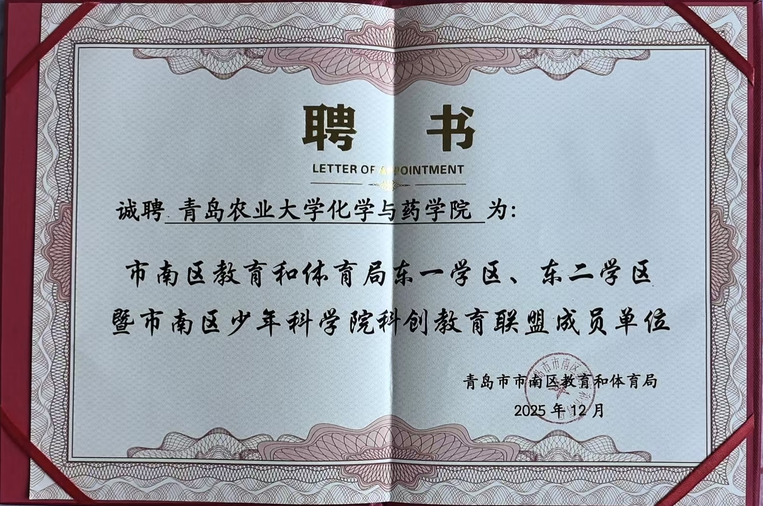 此次获聘为科创教育联盟成员单位,是学院深化社会服务、推动青少年科学教育的重要契机。未来,学院将充分发挥在化学、药学与制药工程领域的专业优势,与联盟成员单位开展深度协作,共同构建资源共享、协同育人科创平台,着力提升区域青少年科学素养与创新能力,为市南区基础教育高质量发展持续贡献高校智慧与力量。