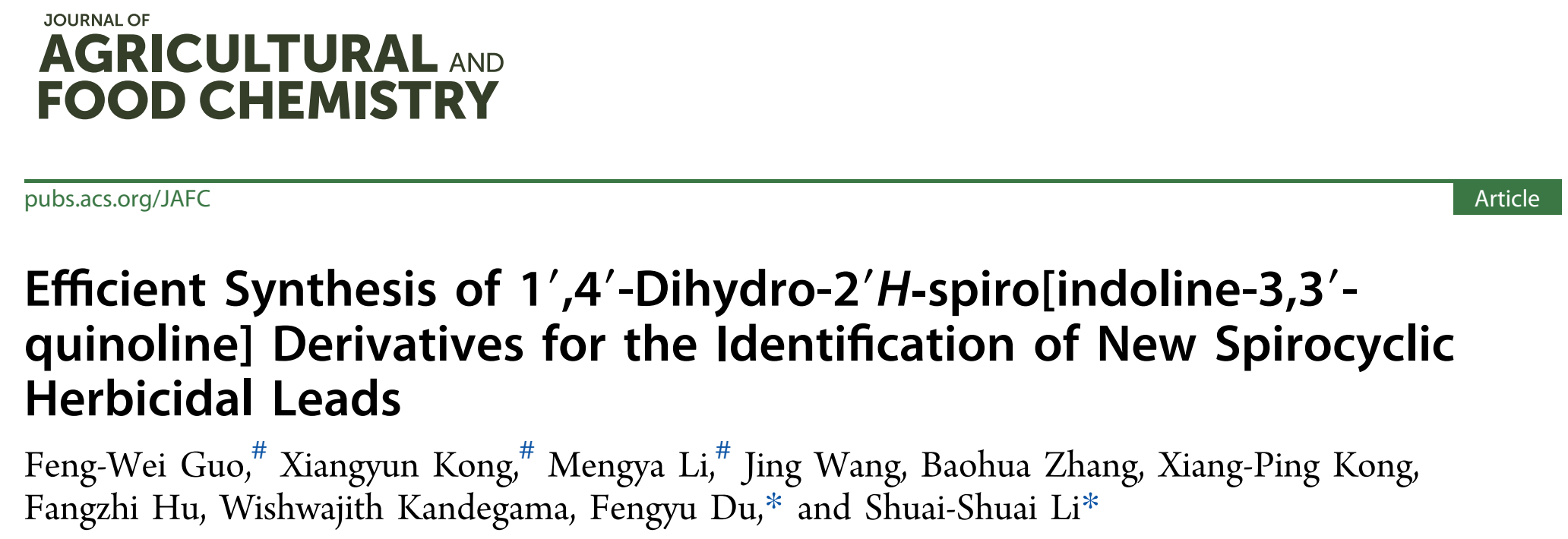 山东省农用药物绿色创制与应用特色实验室李帅帅教授、杜丰玉教授等与中国-斯里兰卡茶叶绿色防控“一带一路”联合实验室合作,开发出将平面芳香分子转化为三维立体螺旋分子的绿色合成方法,建立起系列螺杂环化合物库,并以除草活性为导向开展活性筛选,基于构效关系不断修饰、改造活性分子,最终发掘出除草性能优异的潜力分子,相关工作发表在农林食品科学领域国际期刊Journal of Agricultural and Food Chemistry (Top, 中国科学院一区), DOI: 10.1021/acs.jafc.4c12106.