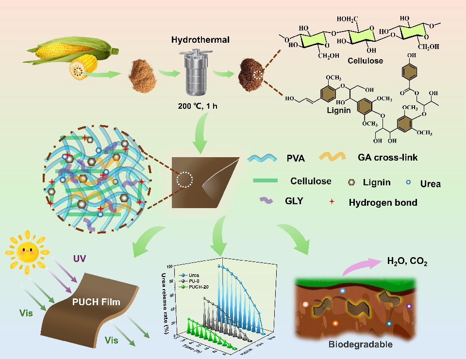 地膜覆盖是现代农业增产稳产的关键技术,但传统聚乙烯地膜难以降解,长期使用造成“白色污染”,且功能单一、成本较高,严重制约农业绿色转型。针对这一瓶颈,团队依托化学、材料与农业多学科交叉优势,创新性地以农业废弃物——玉米芯为原料,通过酸水解与水热预处理提取木质纤维素作为增强填料,结合戊二醛交联、尿素缓释与甘油增塑等策略,成功研制出一种低成本、可生物降解、多功能集成的新型聚乙烯醇基地膜(简称PUCH地膜)。