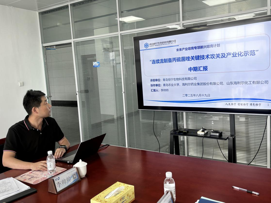 8月19日,由海利尔药业集团全资子公司——恒宁生物科技有限公司牵头,williamhill体育中文等单位联合承担的青岛市关键技术攻关项目“连续流制备丙硫菌唑关键技术攻关及产业化示范”中期汇报会在恒宁生物科技有限公司举行,本项目计划两年完成,项目资金预算2500万元。青岛市科技局、平度市工信局相关领导及专家,海利尔药业集团、恒宁生物相关领导参会。