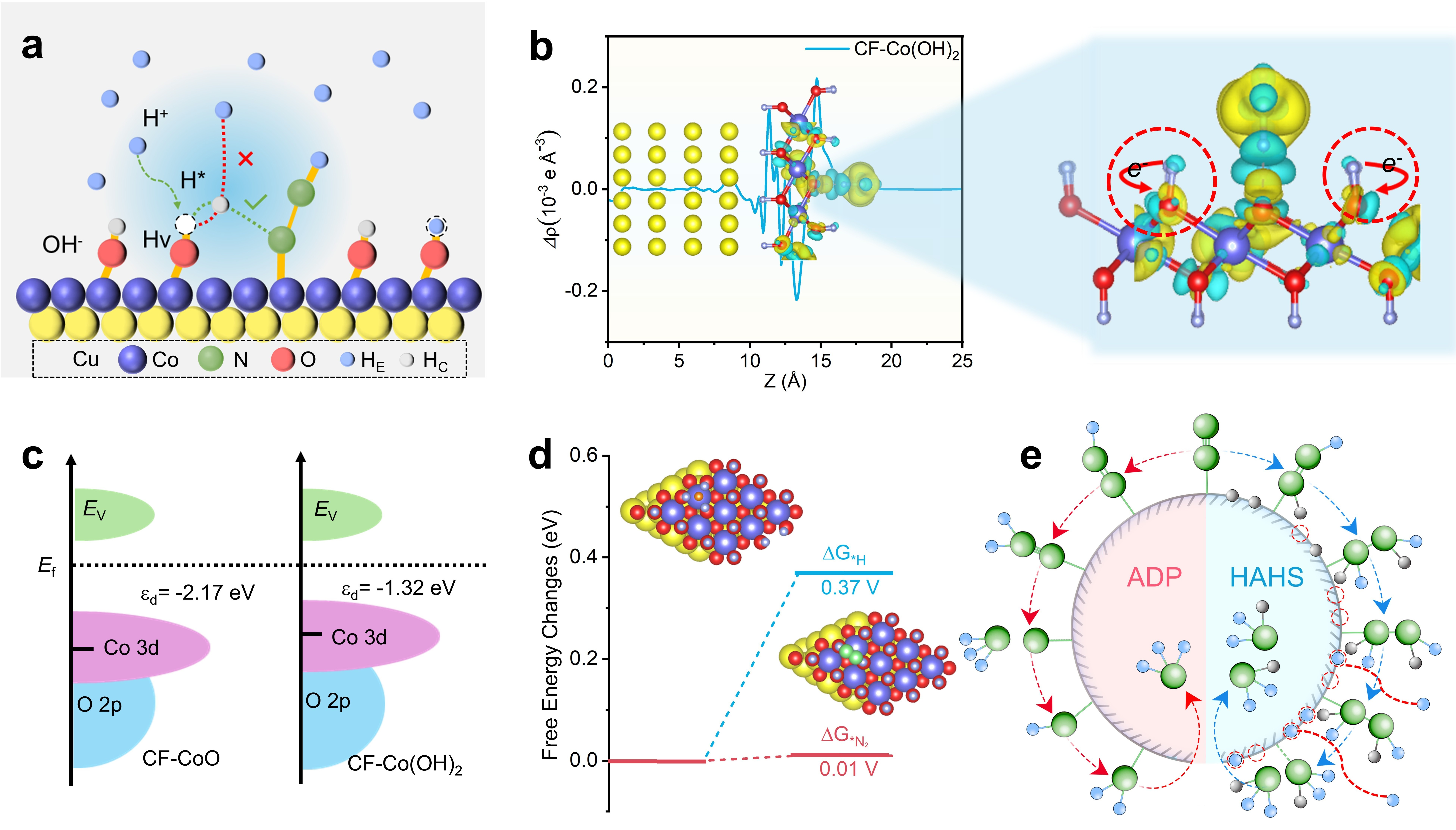 为攻克 NRR 技术 “效率低、副反应多” 的核心难题,团队提出 HAHS 新机理:通过催化剂表面氢物种的精准活化与动态氢空位的协同作用,实现氮气分子在温和条件下的高效活化与逐步加氢。该机制不仅显著降低了氮还原反应能垒,还通过优化氢传递路径,有效抑制了竞争性析氢副反应,大幅提升了合成氨的选择性与法拉第效率,为电化学合成氨从实验室走向规模化应用奠定了关键技术基础。