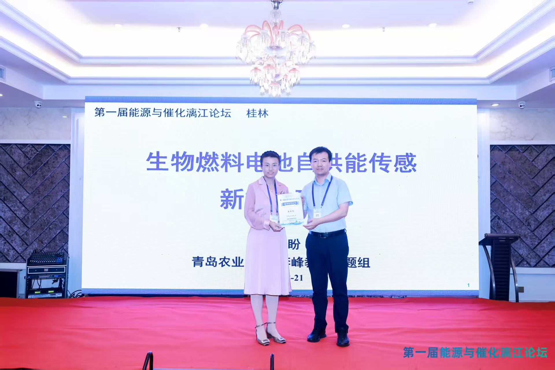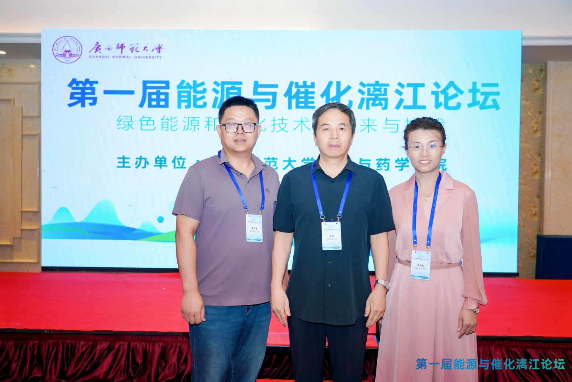 第一届能源与催化漓江论坛于2025年8月20日至22日在广西桂林召开,本次论坛由广西师范大学化学与药学学院主办。会议主题是“绿色能源和催化技术的未来与挑战”,旨在围绕能源与催化研究的创新成果、前沿技术及其未来发展趋势和面临的挑战进行深入探讨,促进学术成果转化。课题组李峰教授、盖盼盼教授和朱党强教授参加,盖盼盼教授作题为《生物燃料电池自供能传感新方法研究》的报告。