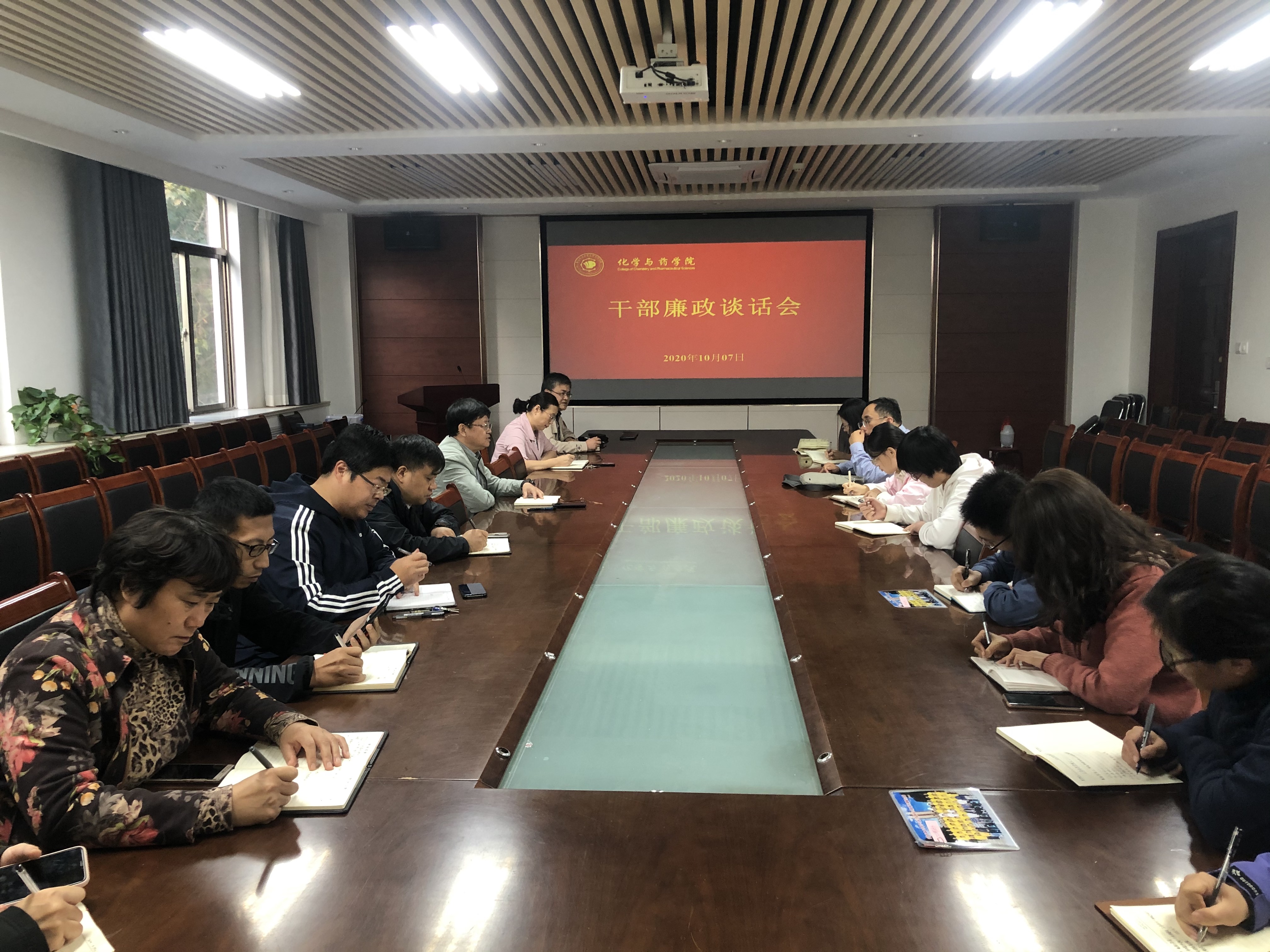 10月7日,williamhill中国在化学楼会议室召开部廉政谈话,谈话由学院党委书记王进国主持,学院党政领导、两办成员、各党支部书记参加。